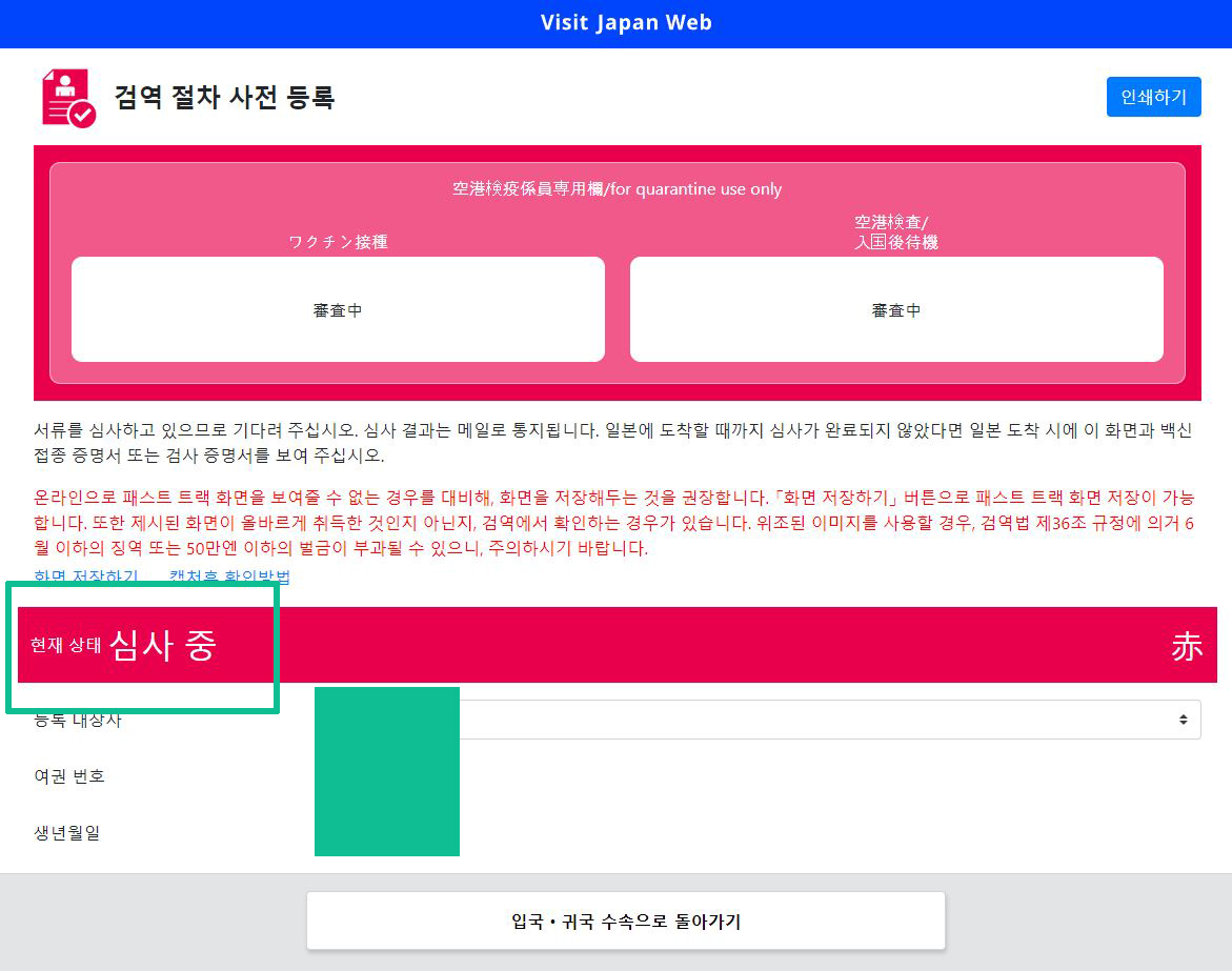 검역 절차 사전등록 상태가 심사 중으로 바뀌었다. 일본 입국 예정일 2주 이내인 사람부터 먼저 서류를 심사하는 절차로 시간이 좀 소요될 수 있다. 심사하는 동안 나머지 입국심사, 세관신고를 진행해보자.