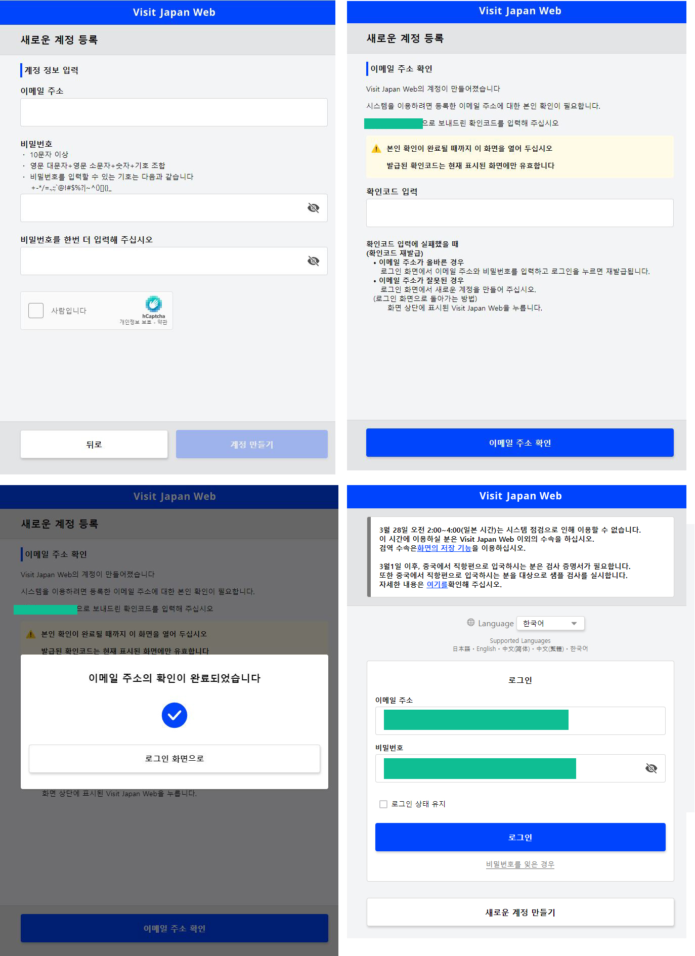 비지트재팬웹 사이트에 접속한 후 계정 만들기를 클릭한다. 이메일 주소로 확인 코드를 받고 확인 후 가입한 아이디와 비밀번호로 로그인한다.