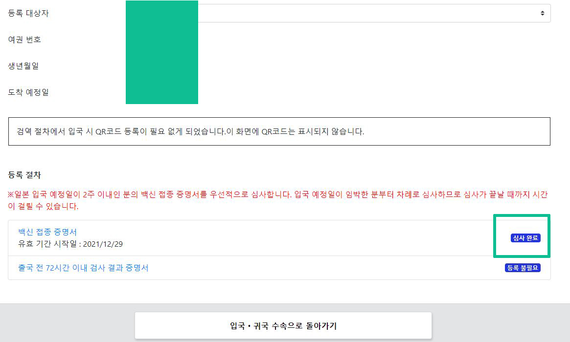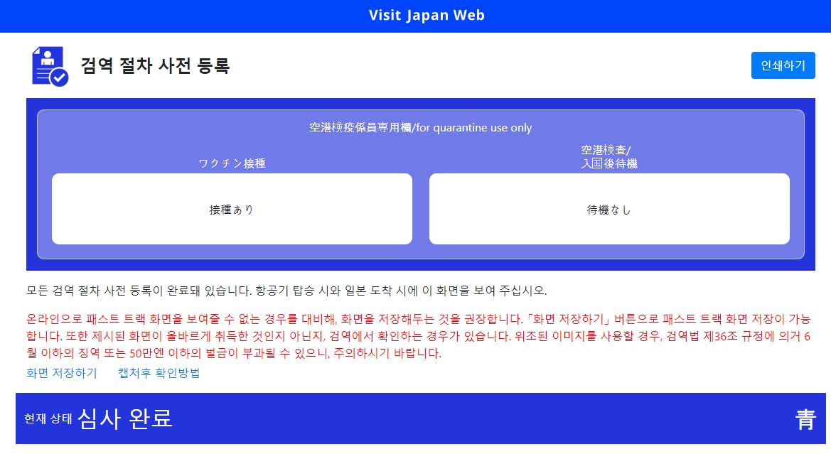 세관신고까지 다 마치면 심사중이던 검역절차 사전등록이 심사완료 되어있을 것이다. 반드시 화면 캡쳐해서 핸드폰에 사진파일로 저장해 놓는다.