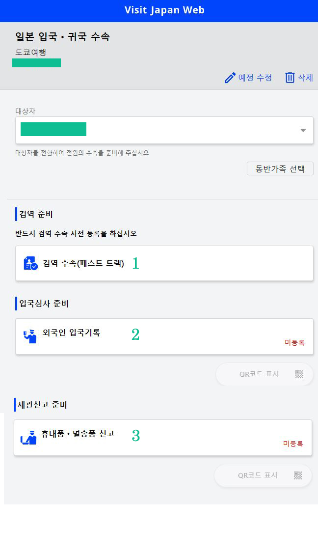 내가 저장한 여행 탭을 눌러서 검역수속, 입국심사, 세관신고를 차례로 등록한다.